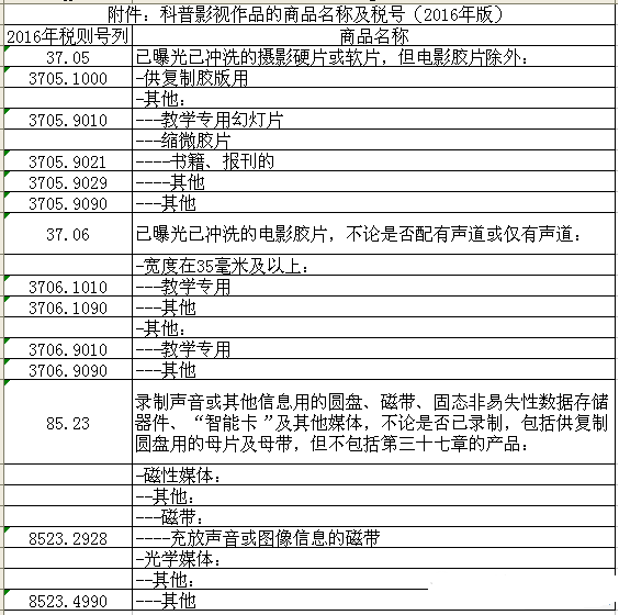 对上述科普单位以其他形式进口的自用影视作品,免征进口关税和进口环节增值税,进口科影视作品的商品名称及税号见附件。