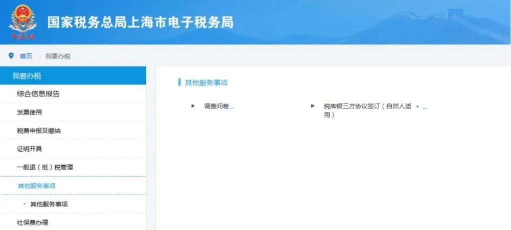 以自然人身份登录上海市电子税务局,点击首页“我要办税”中的“其他服务事项”菜单,点击“税库银三方协议签订(自然人适用)”进入办理页面。