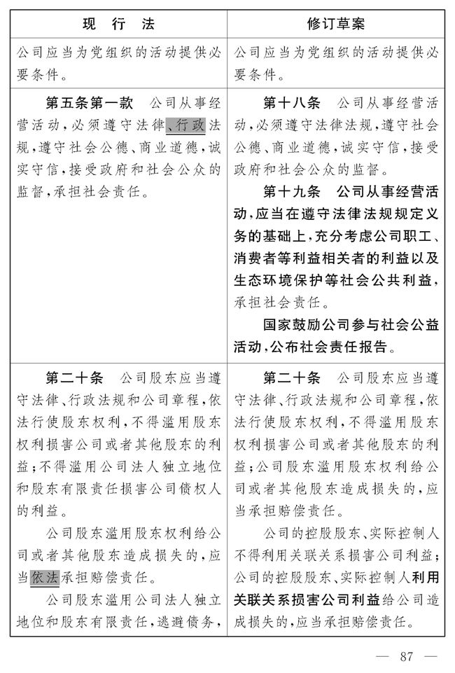 贯彻党的十八届四中全会决定有关要求,加强公司社会责任建设,增加规定:公司从事经营活动,应当在遵守法律法规规定义务的基础上,充分考虑公司职工、消费者等利益相关者的利益以及生态环境保护等社会公共利益,承担社会责任;国家鼓励公司参与社会公益活动,公布社会责任报告。(修订草案第十九条)