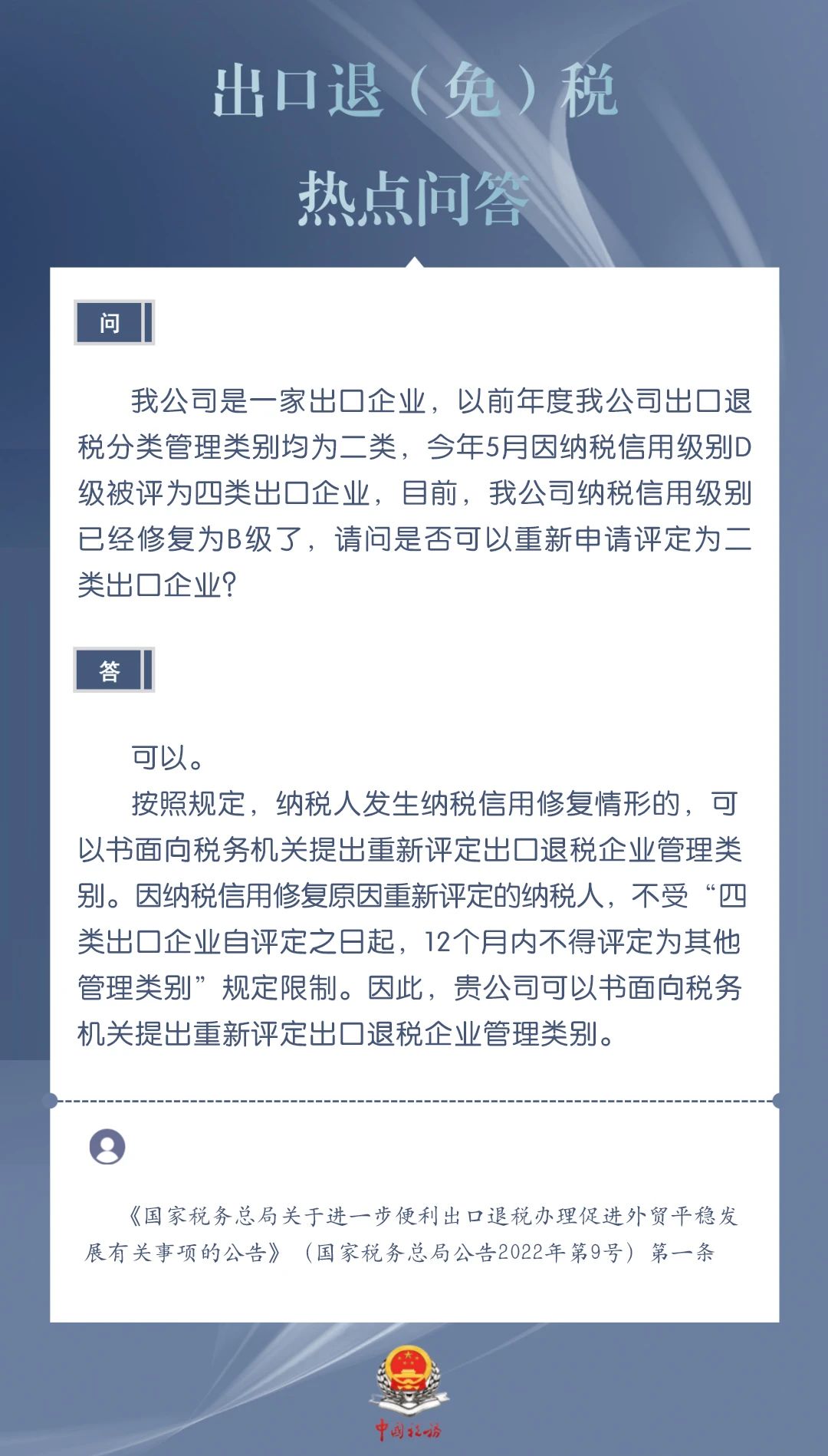 为进一步加力支持包括中小微企业在内的广大经营主体开展外贸出口业务,便于企业掌握出口退税现行规定、及时了解出口退税便利化举措,商务部、国家税务总局针对企业普遍关心的出口退税热点问题,整理了问答集锦。一起来看看吧↓