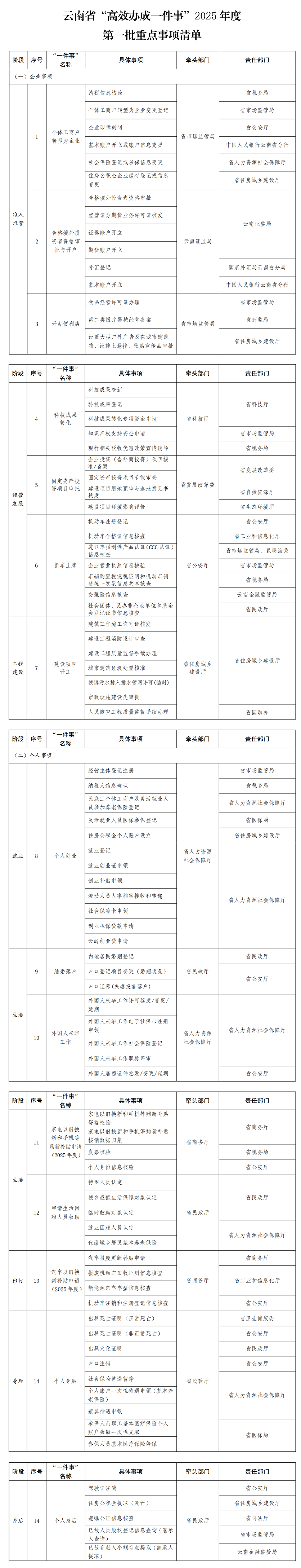 《云南省“高效办成一件事”2025年度第一批重点事项清单》已经省人民政府同意,现印发给你们,请结合实际认真组织实施。