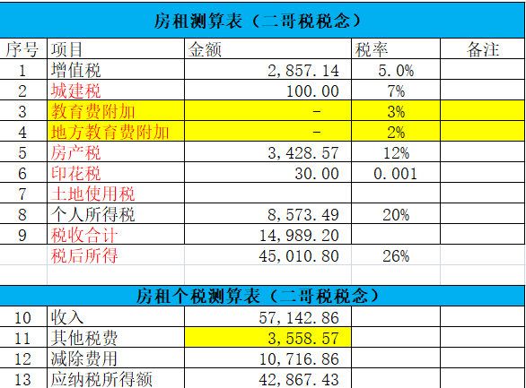 假如出租个人住房取得年租金60000,开具专票发票的话,那么实际应该缴纳的税分别是: