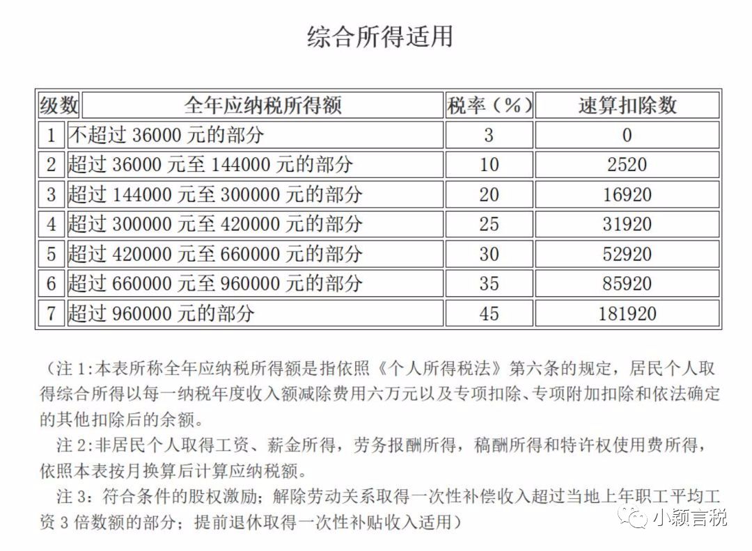 按照综合所得税率表:税率10%,速算扣除数2520;
