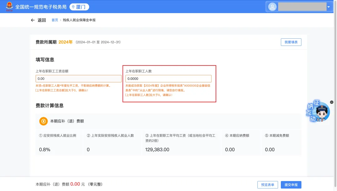 ?注意:根据全国统一规范电子税务局预填规则,“上年在职职工人数”预填数取自2024年度企业所得税年报表中的“从业人数”,预填数应根据实际用工情况进行修改。如未成功获取上述数据,则预填为0,需自行填报人数。