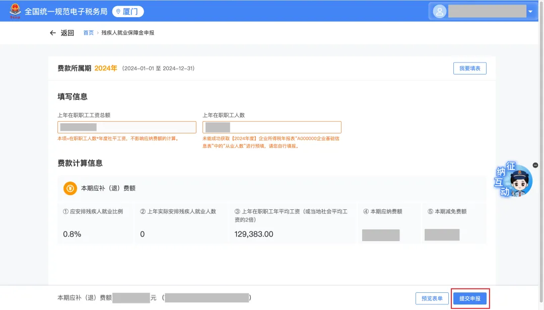 “上年在职职工人数”填写或确认完毕后,进一步确认“本期应纳费额”、“本期减免费额”以及“本期应补(退)费额”。