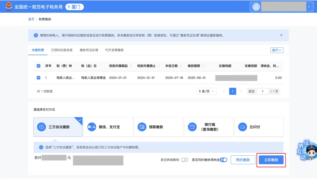 可自行选择支付方式,点击【立即缴款】即可完成缴款。
