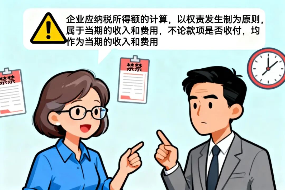 企业应纳税所得额的计算,以权责发生制为原则,属于当期的收入和费用,不论款项是否收付,均作为当期的收入和费用;不属于当期的收入和费用,即使款项已经在当期收付,均不作为当期的收入和费用。本条例和国务院财政、税务主管部门另有规定的除外。