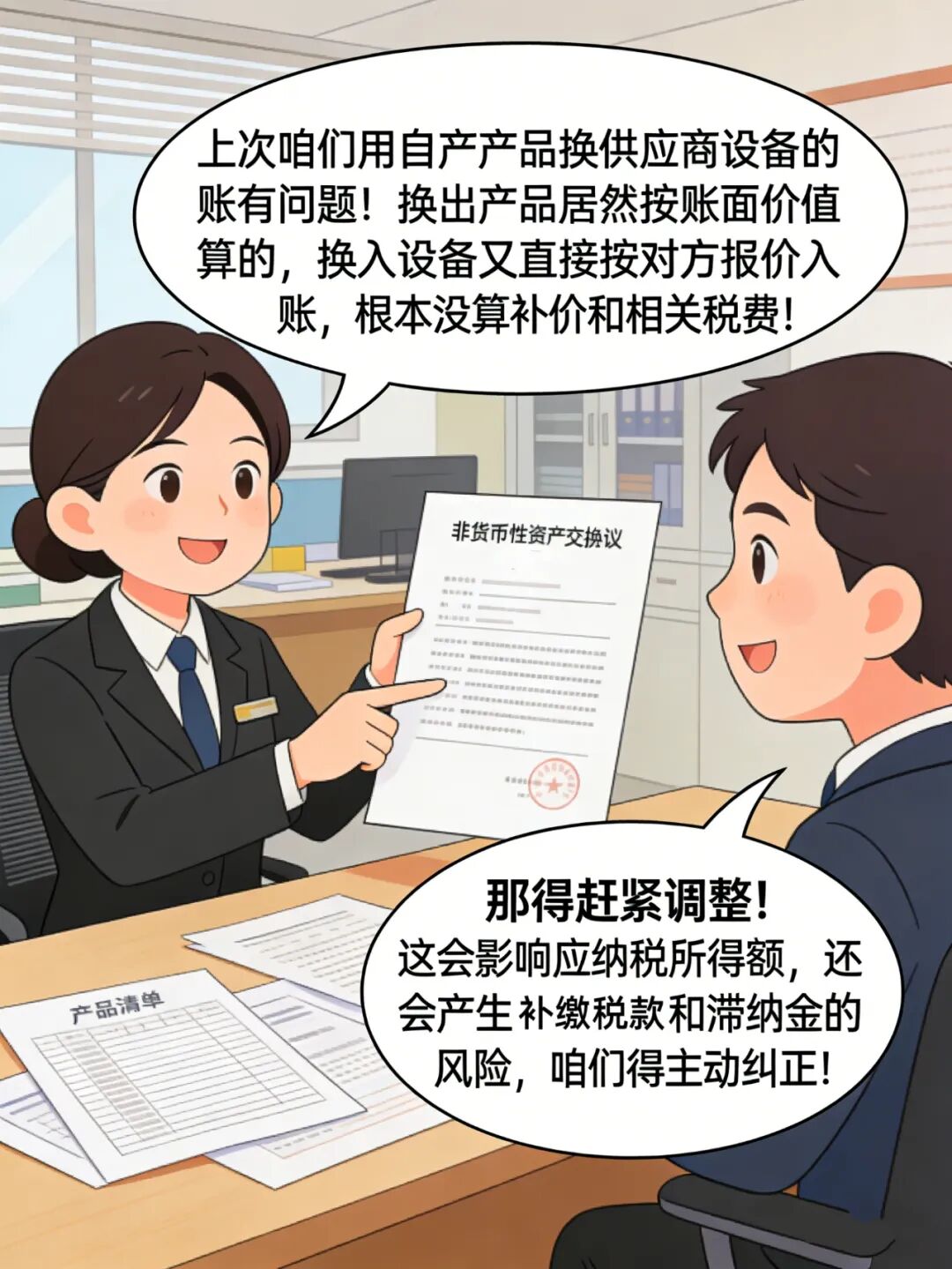 企业在生产经营过程中将对通过将产品、机器设备与其他企业交换其他产品,企业对这项非货币性资产交换业务未按照税法和相关财务准则的要求正确确认换入换出成本,影响应纳税所得额,带来相应税务风险。