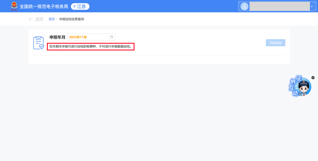 对应申报年月未完成自检,且未申报可以进行自检的税费种。此时,【开始自检】按钮处于置灰状态,不可点击。
