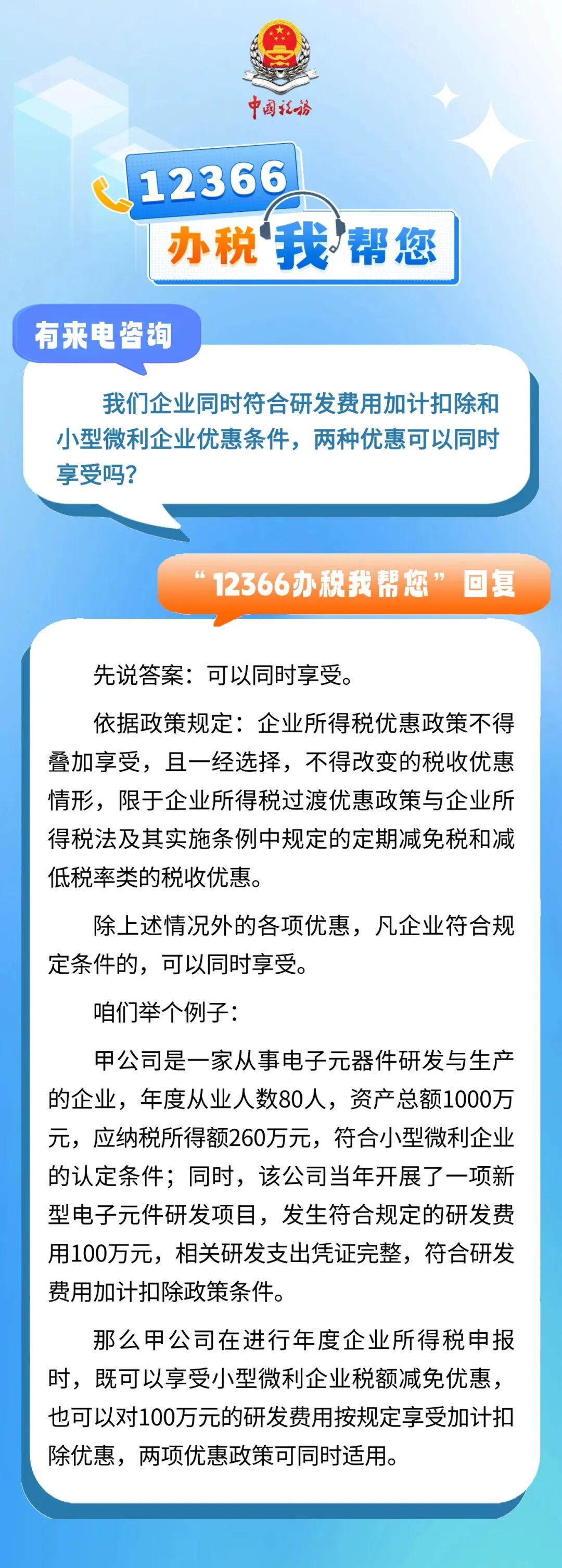 有来电咨询 :我们企业同时符合研发费用加计扣除和小型微利企业优惠条件,两种优惠可以同时享受吗?一起来看看回复吧↓