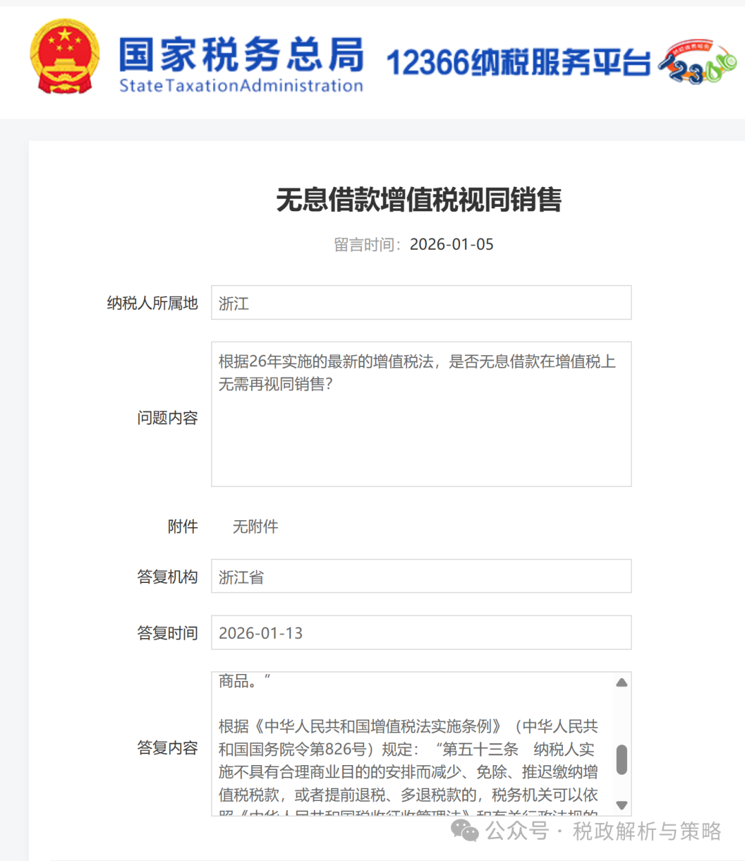 根据26年实施的最新的增值税法,是否无息借款在增值税上无需再视同销售?税局在回答的最后附上第五十三条“反避税”条款