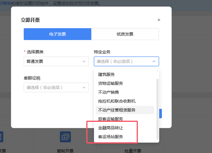 最近打开电子税务局开票的财务朋友,可能发现了一个细节变化:开票界面的“特定业务”下拉菜单里,多了两个新选项——“客运场站服务”和“金融商品转让”。