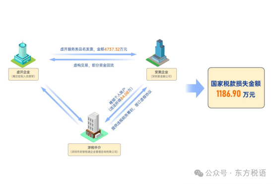 经查,2019年至2021年,深圳市财智恒通企业管理咨询有限公司在为深圳市鼎信私募股权基金管理有限公司提供涉税服务时,主动提出可通过虚列成本等方式来降低税负的违规税务策划方案,以非法提供银行账户等方式,帮助其获得其他企业虚开的增值税专用发票52份,涉及金额合计4792.11万元,导致少缴税款合计1186.90万元,并从中获利共计84.08万元。2025年6月,税务部门根据《中华人民共和国税收征收管理法实施细则》第九十三条,对深圳市财智恒通企业管理咨询有限公司作出没收违法所得84.08万元、并处其代理企业少缴税款0.5倍罚款共计593.45万元的处理处罚决定;根据涉税专业服务管理相关规定,对其采取列为涉税服务失信主体等措施。同时,税务部门依法对深圳市鼎信私募股权基金管理有限公司进行处理处罚。目前,公安机关已对该涉税中介机构实际控制人褚斌,以及虚开发票企业实际控制人颜军采取强制措施,近期将移交检察机关审查起诉。