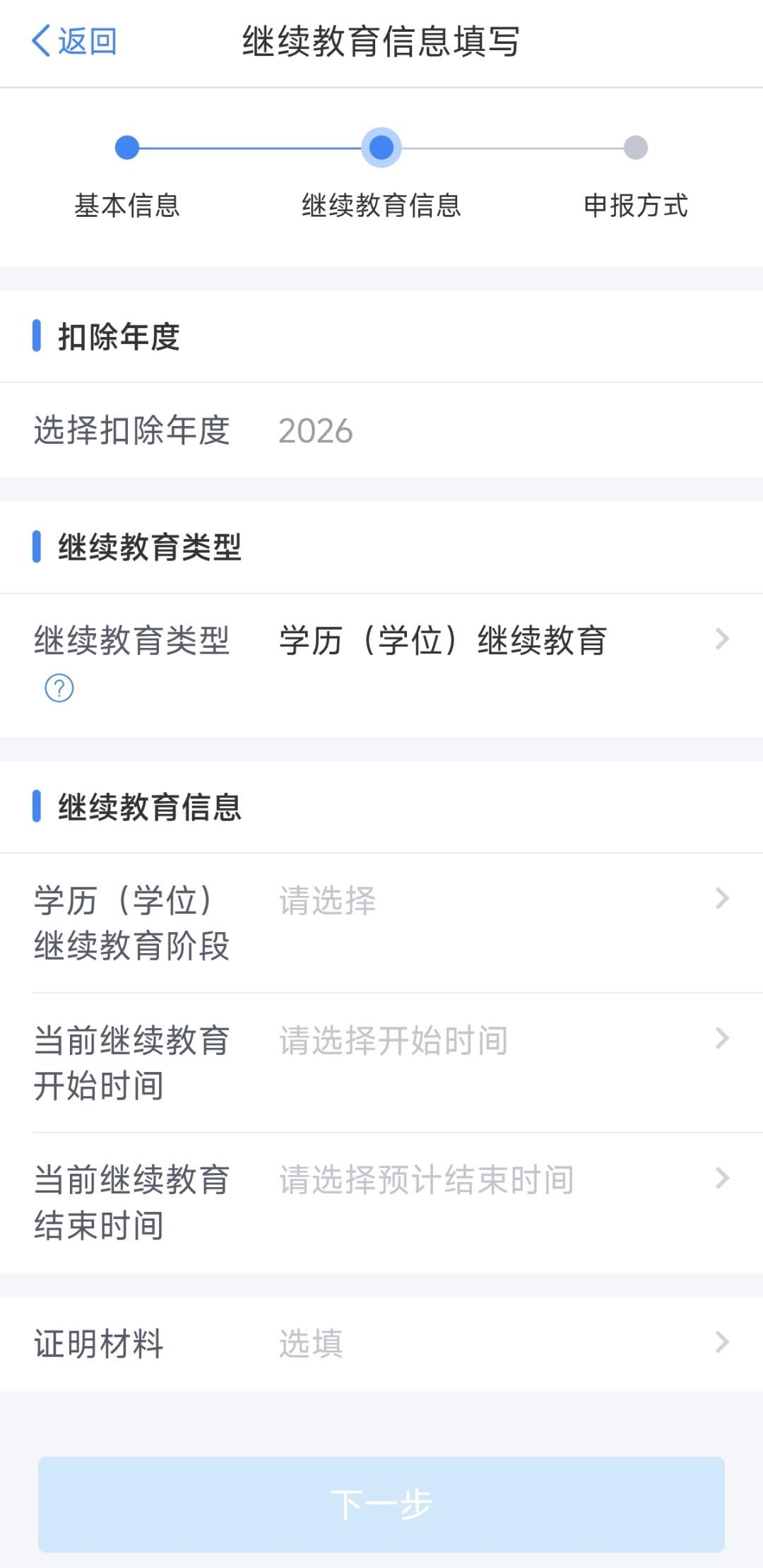 登录后即可跳转至“专项附加扣除”填报界面,点击需要补充填报的专项附加扣除项目,例如继续教育。