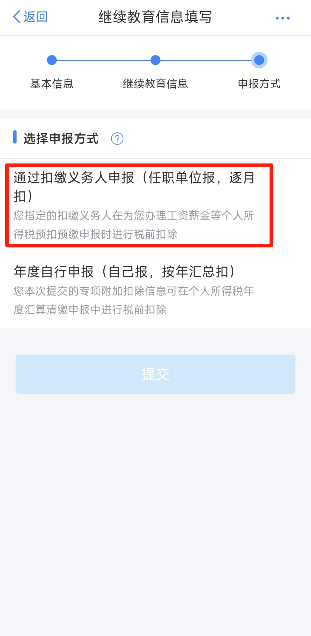 选择申报方式为【通过扣缴义务人申报】,即可在预扣预缴时享受专项附加扣除;或者选择【年度自行申报】,将在汇算清缴时享受专项附加扣除。