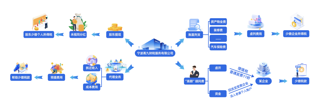 经查实,宁波甬九财税服务有限公司及其实际控制人凌珊帮助其所代理的某企业预提费用科目虚列成本导致其少缴税款105万元。同时,其自身还存在虚列费用238.34万元,对外虚开增值税普通发票11份,涉及金额100万元,未按规定代扣代缴个人所得税等违法行为。