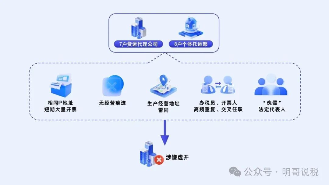 前期,伊犁州税务局通过税收大数据分析发现,辖区内的7户货物运输代理公司、8户个体托运部不仅登记的生产经营地址存在雷同,还在短期内使用相同开票地址频繁开具大量国内运输业务增值税发票,这引起了检查人员的高度警觉。