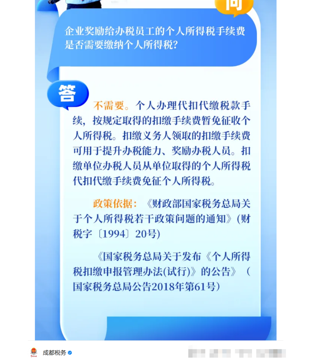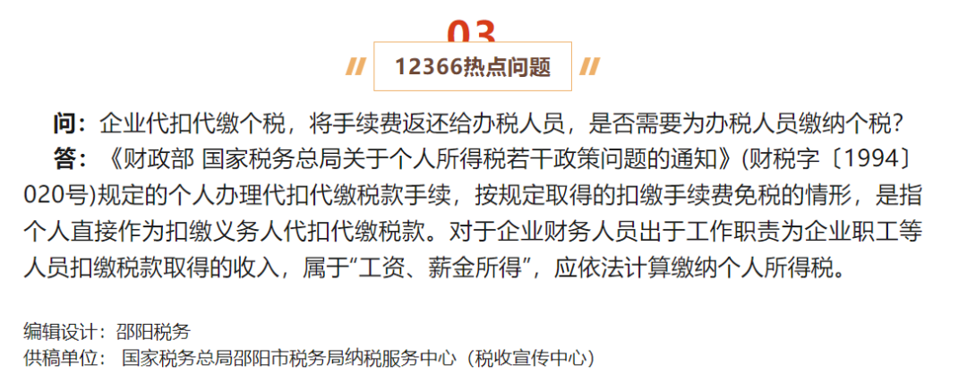 问:企业代扣代缴个税,将手续费返还给办税人员,是否需要为办税人员缴纳个税?(邵阳税务)
