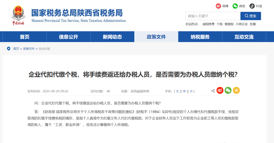 问:企业代扣代缴个税,将手续费返还给办税人员,是否需要为办税人员缴纳个税?(陕西省税务局)
