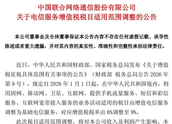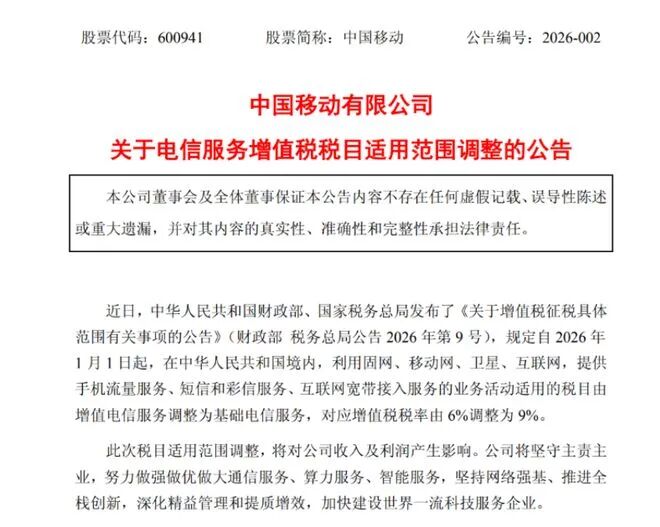 2月1日,中国移动(600941.SH)公告称,规定自2026年1月1日起,在中华人民共和国境内,利用固网、移动网、卫星、互联网,提供手机流量服务、短信和彩信服务、互联网宽带接入服务的业务活动适用的税目由增值电信服务调整为基础电信服务, 对应增值税税率由6%调整为9%。 此次税目适用范围调整, 将对公司收入及利润产生影响。