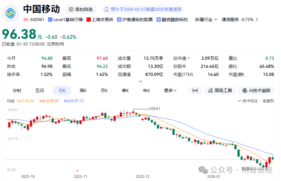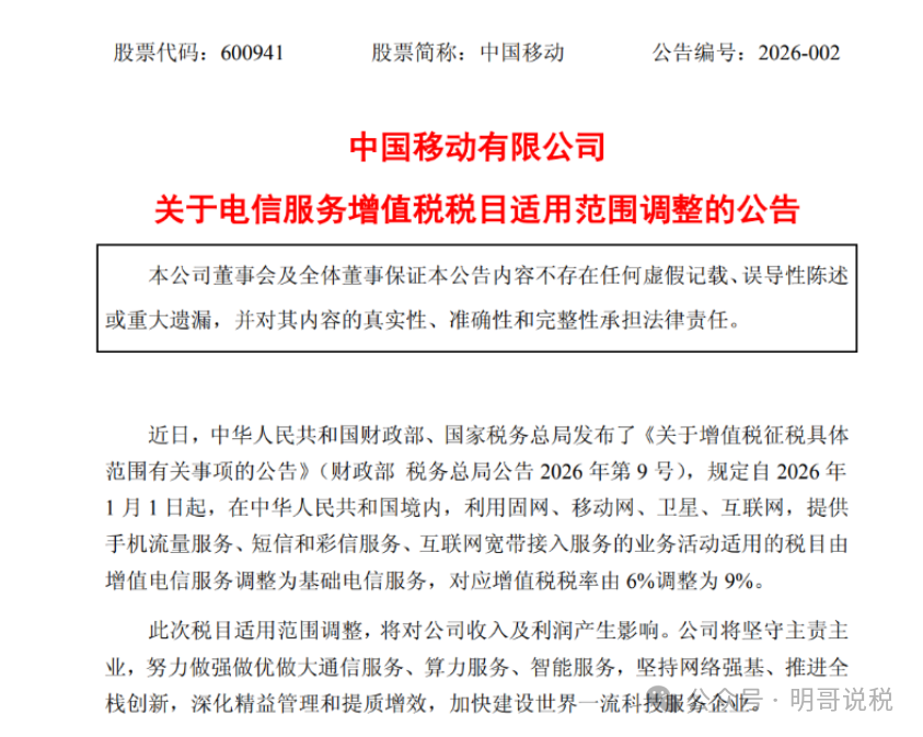 中国移动今日公告称,近日,中华人民共和国财政部、国家税务总局发布了《关于增值税征税具体范围有关事项的公告》(财政部 税务总局公告2026年第9号),规定自2026年1月1日起,在中华人民共和国境内,利用固网、移动网、卫星、互联网,提供手机流量服务、短信和彩信服务、互联网宽带接入服务的业务活动适用的税目由增值电信服务调整为基础电信服务,对应增值税税率由6%调整为9%。此次税目适用范围调整,将对公司收入及利润产生影响。