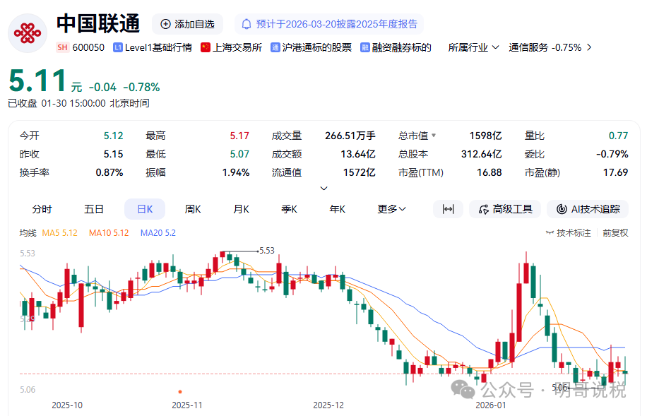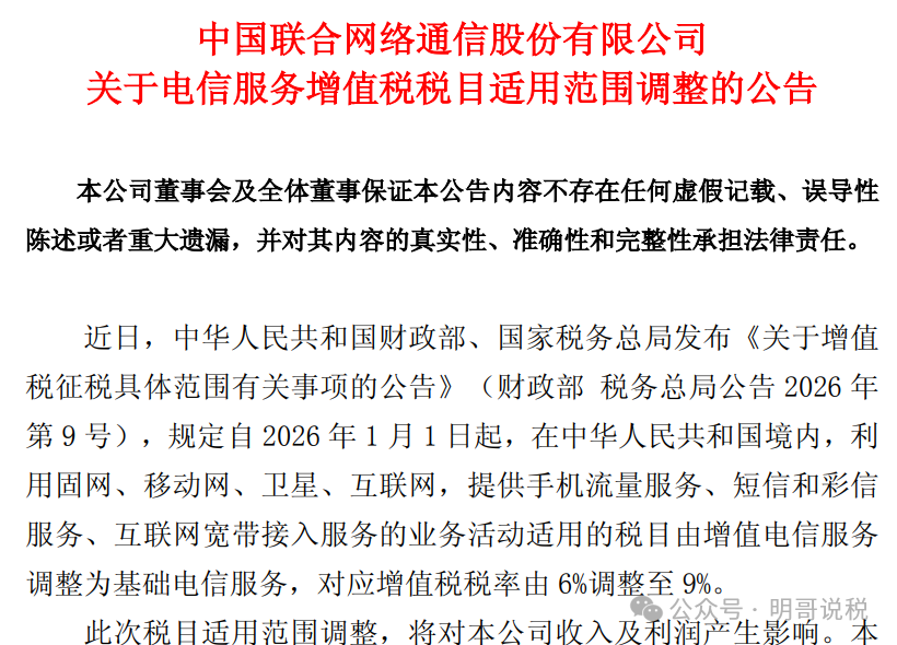 中国联通今日公告称,近日,中华人民共和国财政部、国家税务总局发布《关于增值税征税具体范围有关事项的公告》(财政部 税务总局公告2026年第9号),规定自2026年1月1日起,在中华人民共和国境内,利用固网、移动网、卫星、互联网,提供手机流量服务、短信和彩信服务、互联网宽带接入服务的业务活动适用的税目由增值电信服务调整为基础电信服务,对应增值税税率由6%调整至9%。此次税目适用范围调整,将对本公司收入及利润产生影响。