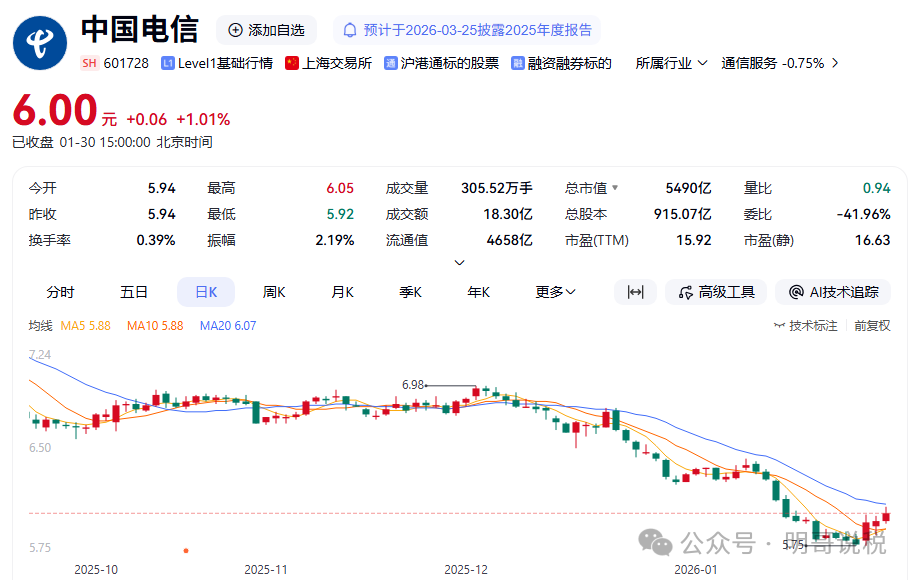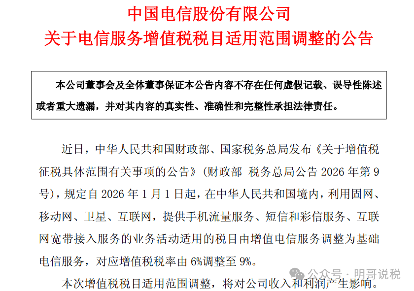 中国电信今日公告称,近日,中华人民共和国财政部、国家税务总局发布《关于增值税征税具体范围有关事项的公告》(财政部 税务总局公告2026年第9号),规定自2026年1月1日起,在中华人民共和国境内,利用固网、移动网、卫星、互联网,提供手机流量服务、短信和彩信服务、互联网宽带接入服务的业务活动适用的税目由增值电信服务调整为基础电信服务,对应增值税税率由6%调整至9%。本次增值税税目适用范围调整,将对公司收入和利润产生影响。