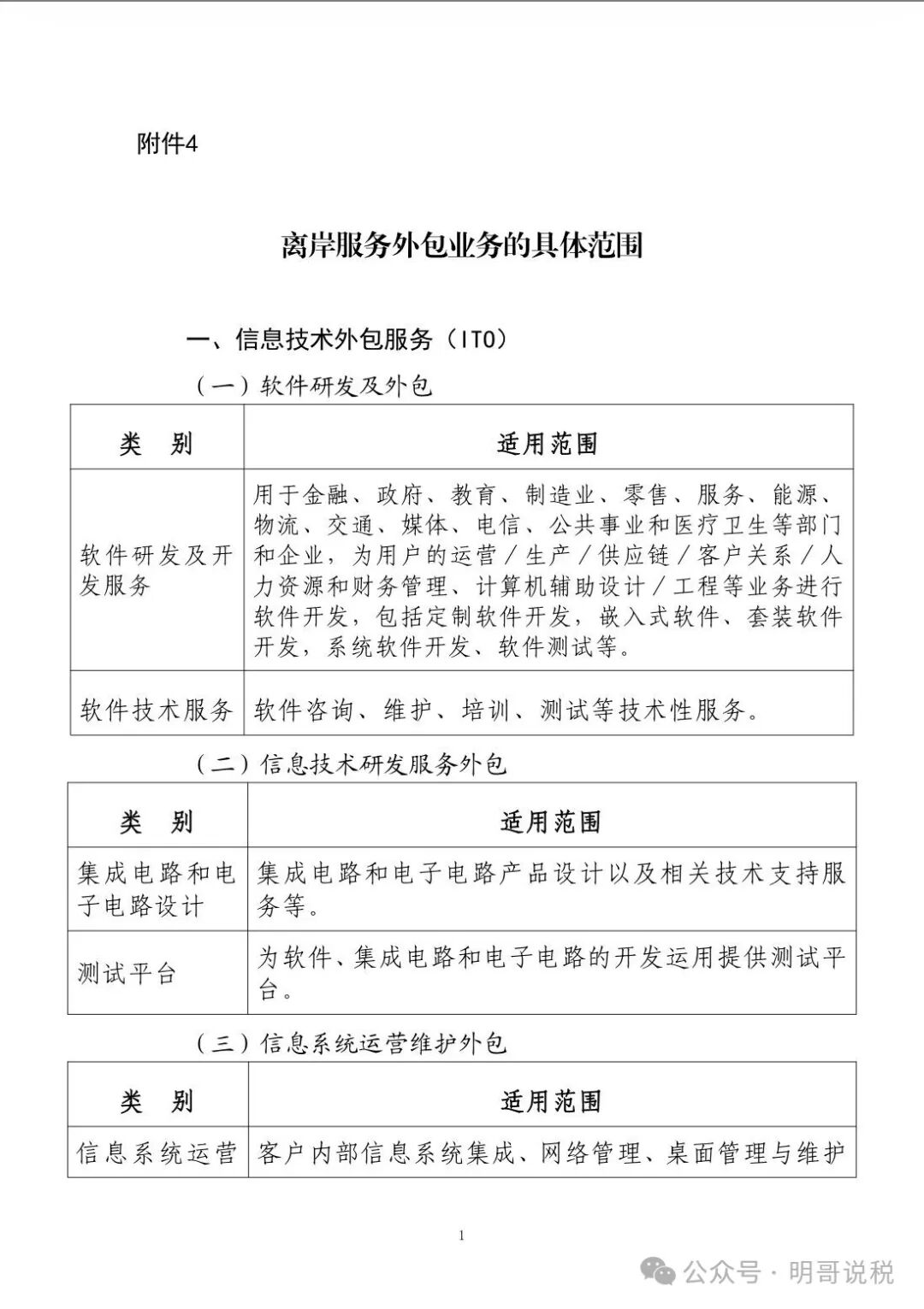 本目所涉及的具体业务活动,按照财政部、税务总局公布的销售服务、无形资产、不动产注释相对应的业务活动执行,其中离岸服务外包业务的具体范围见附件4。