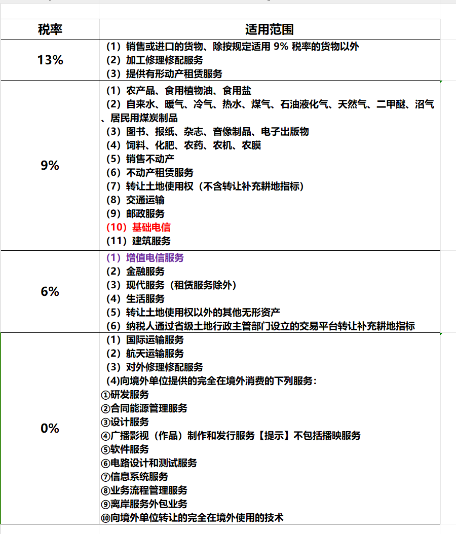 通过以上税率表可知,基础电信服务增值税税率9%,增值电信服务税率6%。