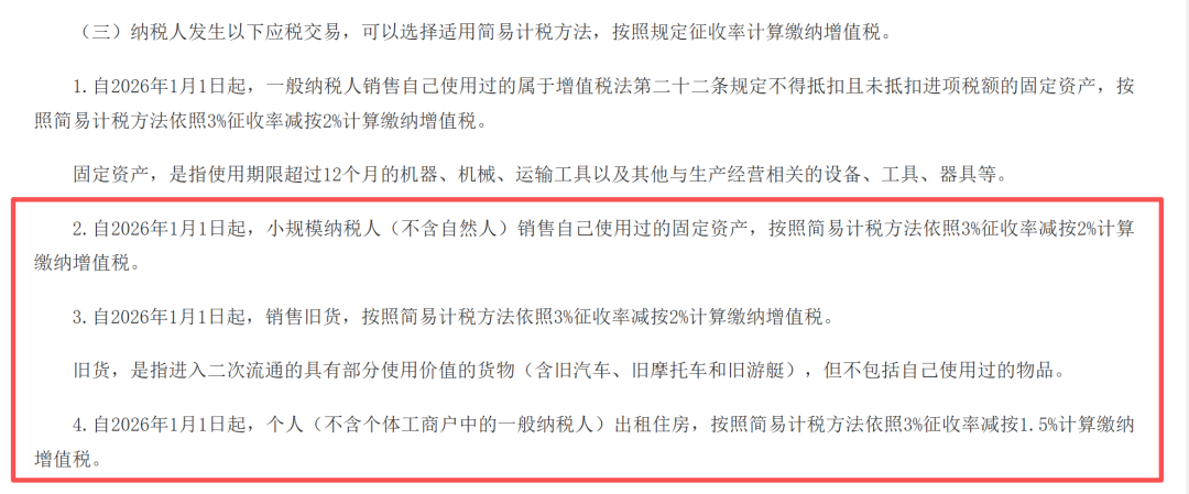 3、另有两类特殊减征规则(与 1% 减征并行,不冲突):小规模纳税人(不含自然人)销售自己使用过的固定资产、销售旧货,按 3% 减按 2%计税;个人出租住房按3% 减按 1.5%计税,均不适用 1% 减征政策。