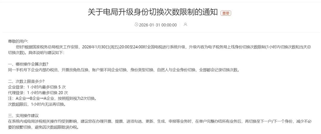 您好!根据国家税务总局相关工作安排,2026年1月30日(周五)20:00至24.00时全国电税进行系统升级,升级内容为电子税务局上线身份切换次数限制(1小时内切换次数和当天总切换次数)。具体说明与建议如下: