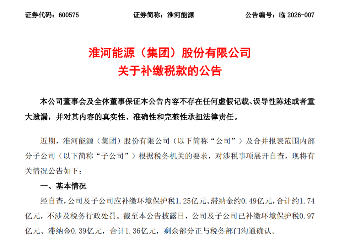 淮河能源:应补缴环境保护税及滞纳金约约1.74亿元