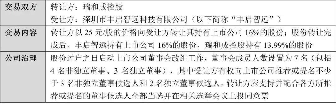 在该案例中,原控股股东放弃了所持股份的表决权,同时将所持5%股份转让给新控股股东苏州绿脉,新控股股东苏州绿脉所持权益股份增加至20%,未触发要约收购。同时,该公司股权较为分散,交易完成后苏州绿脉持股比例较低,苏州绿脉还通过改组董事会使其提名或推荐的董事占到6/7,从而实现了对和顺电气的控制。