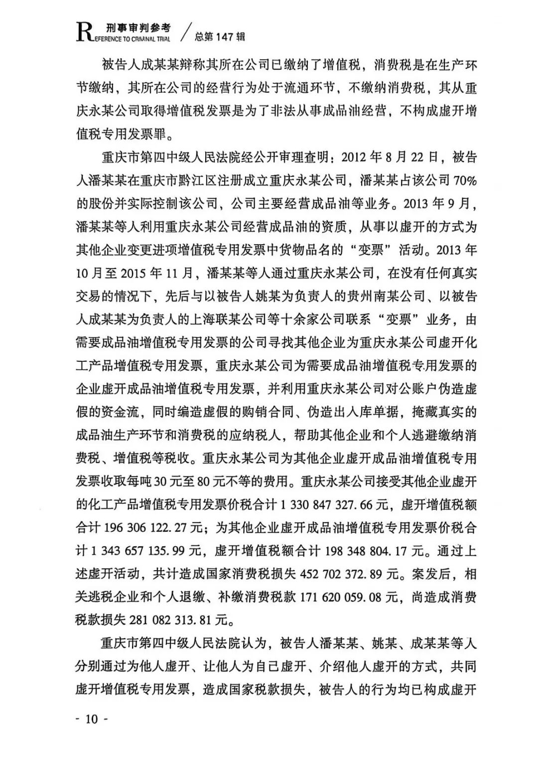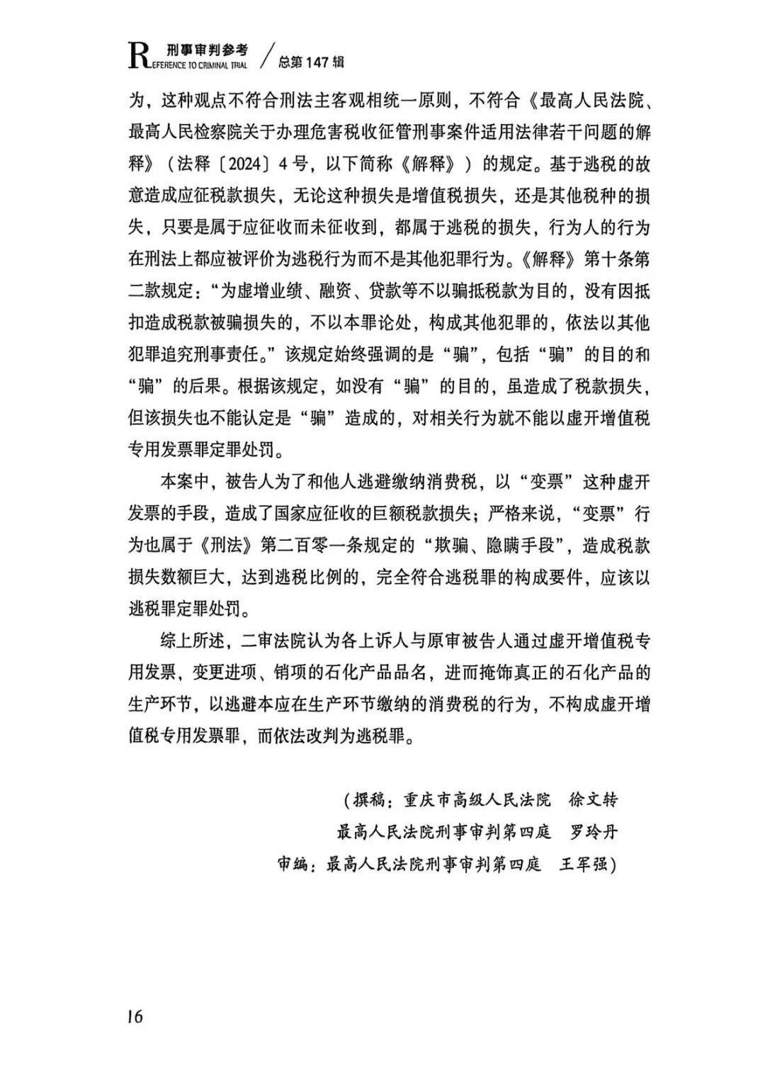 2026年3月,最高人民法院刑事审判第四庭编写的《刑事审判参考(惩处危害税收征管犯罪专辑)》一书在人民法院出版社出版发行。该书收录的潘某某等人逃税案是一起典型的、传统的石化贸易公司变票案件。本案的司法裁判结论系按照逃税罪论处,对于当前成品油模块上线后出现的新型变票逃税案件具有重要的和直接的指导借鉴意义,对于过去一段时间以来按照虚开专票罪论处的错误判决也有积极的纠错意义,呼吁各地人民法院应当依循该起案例的罪名适用逻辑裁判类案。