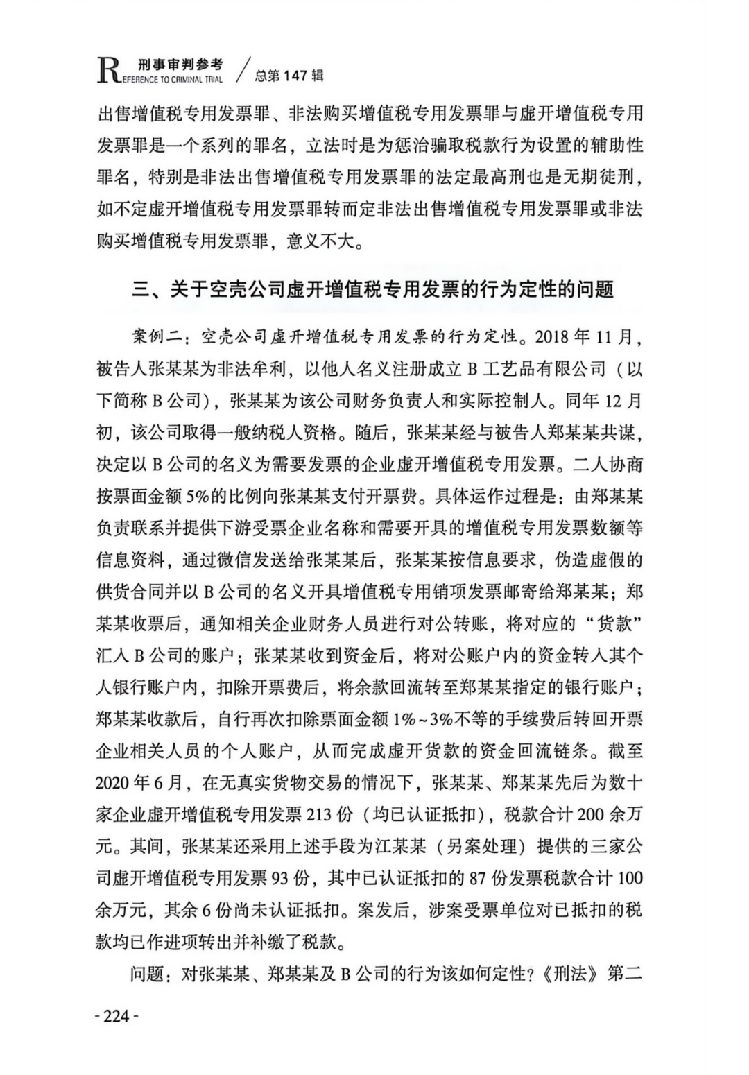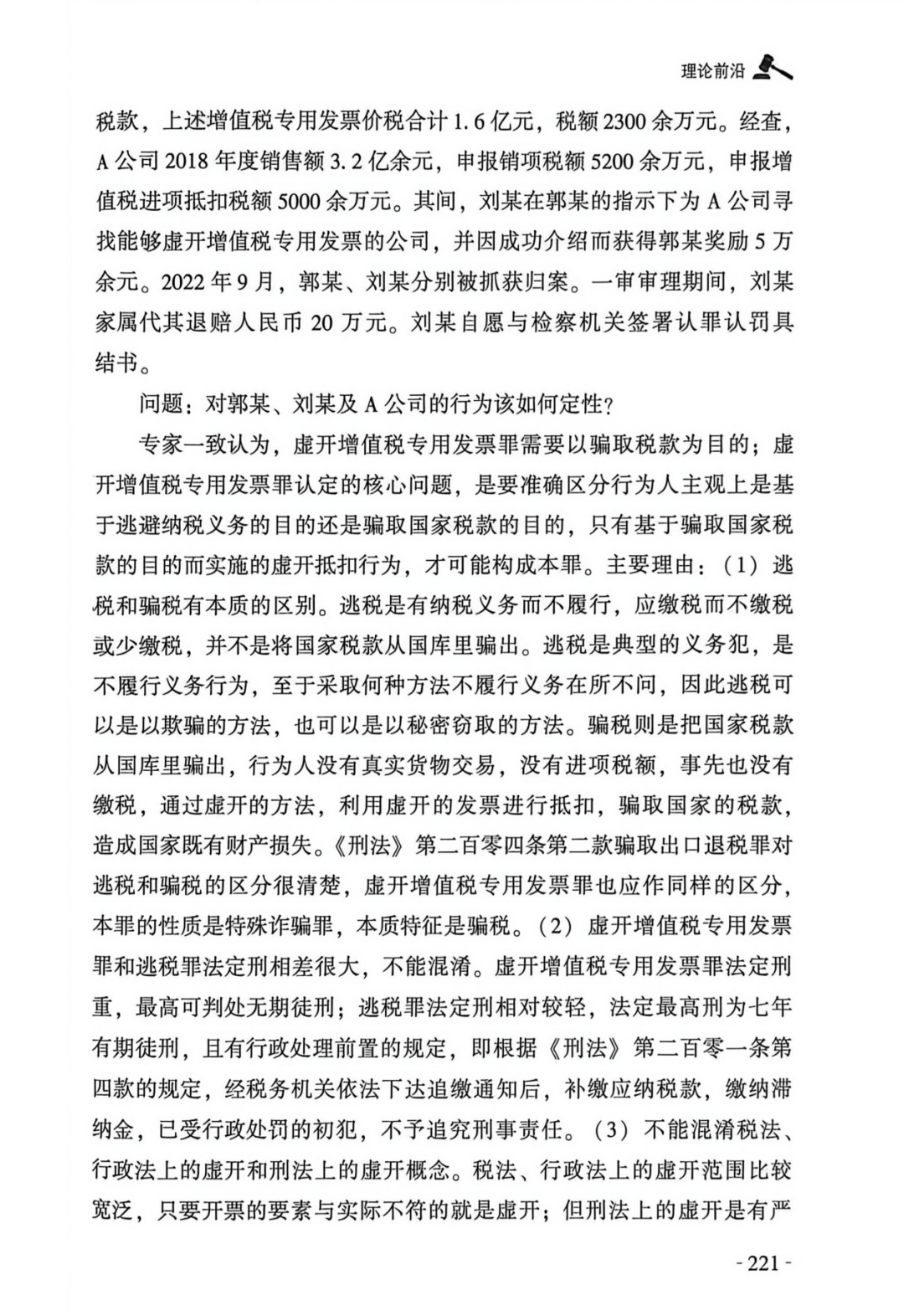 编者按:近日,由最高人民法院刑事审判第四庭编写的《刑事审判参考(惩处危害税收征管犯罪专辑)》已在人民法院出版社出版发行。本书收录了最高人民法院于2025年3月14日组织召开的关于虚开增值税专用发票罪法律适用问题专家论证会的会议纪要,对于从学理上正确理解两高涉税司法解释条款具有重要参考价值和指导意义。现将该部分内容选摘如下: