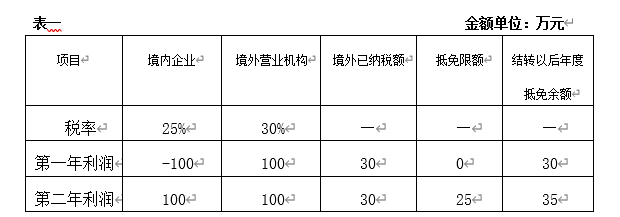 第一年:应纳税所得额=-100+100=0,抵免限额为0,境外已缴税额结转下一年度抵补余额为30万元。