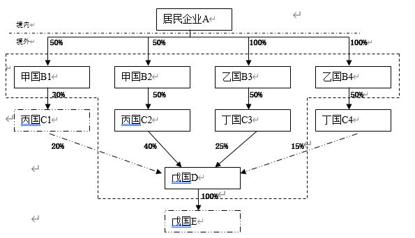 中国居民企业A分别控股了四家公司甲国B1、甲国B2、乙国B3、乙国B4,持股比例分别为50%、50%、100%、100%;B1持有丙国C1公司30%股份,B2持有丙国C2公司50%股份,B3持有丁国C3公司50%股份,B4持有丁国C4公司50%股份;C1、C2、C3、C4分别持有戊国D公司20%、40%、25%、15%股份;D公司持有戊国E公司100%股份。图示如下: