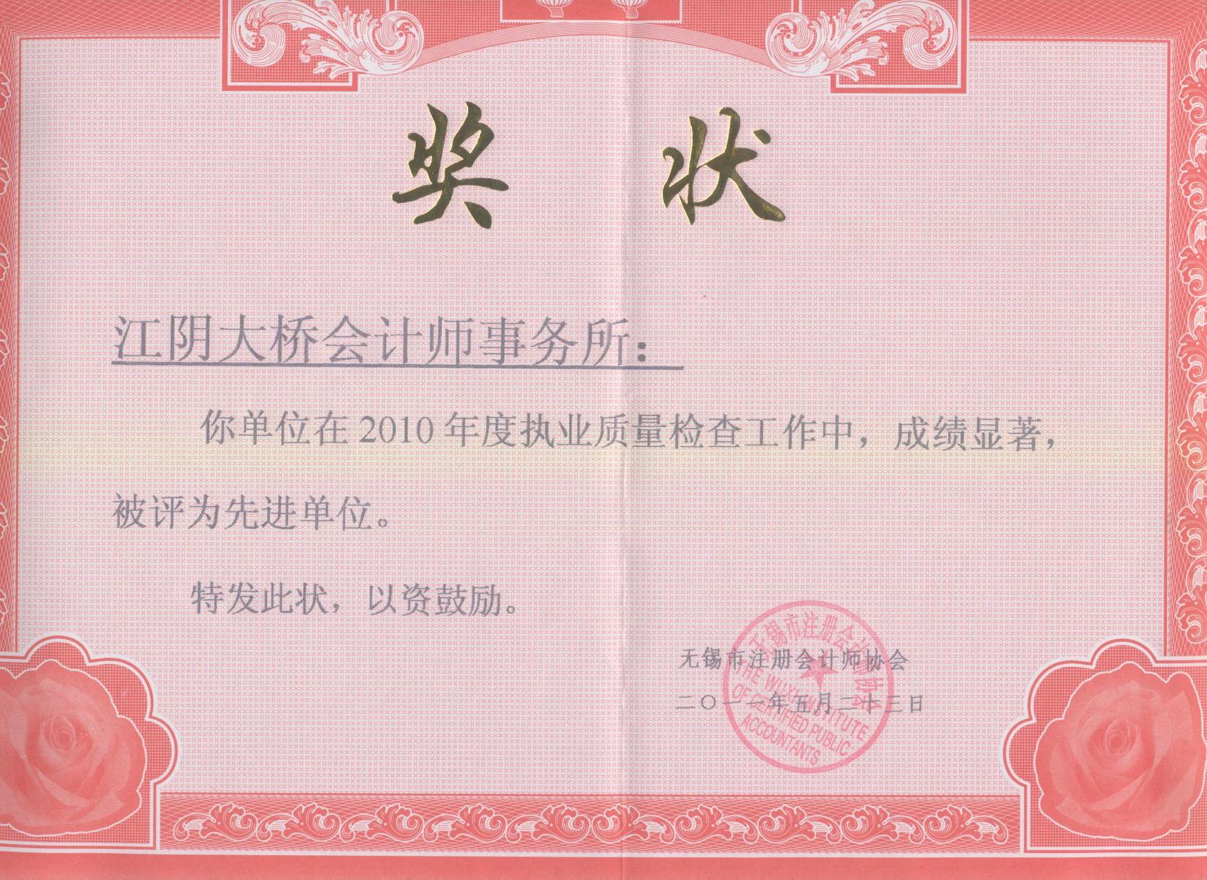本所因一贯坚持独立、客观、公正执业,注重执业质量,注重职业道德,不出虚假报告,在2010年省财政厅及省册会计师协联合执业质量检查中,以较高水准的执业质量顺利通过了检查,受到财政厅、注协领导的肯定等。在2011年6月30日无锡市注册会计师协会召开的工作会议上因执业质量优秀获评“先进单位”。