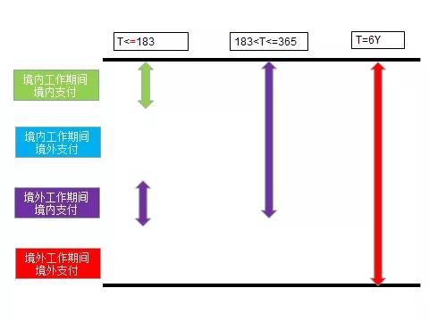 这里要注意,无协定的无住所个人,在一个纳税年度在中国境内居住超过90天,不足183天时,按国内法规则,对照我的四色图,他应该按绿色模块+蓝色模块交税。