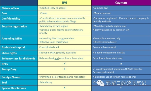 最后找了半天找到了一张图,系统的列明了BVI和开曼群岛公司的利弊。