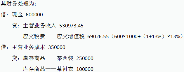 【案例1】某大型商场A在“买一赠一”活动中规定,买一套西装赠送相同品牌的衬衣,当月销售西装1000套,单位售价600元,单位成本250元;赠送衬衣1000件,单位售价200元,单位成本100元。该商场在销售时一概将西装和衬衣同时开在一张发票上,注明折扣额为200元。