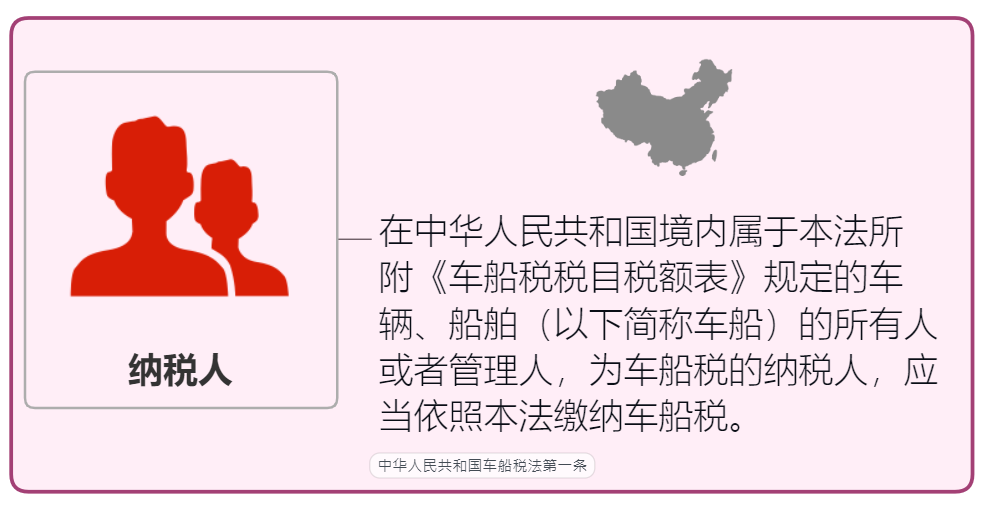 答:《中华人民共和国车船税法》的规定:“第一条 在中华人民共和国境内属于本法所附《车船税税目税额表》规定的车辆、船舶(以下简称车船)的所有人或者管理人,为车船税的纳税人,应当依照本法缴纳车船税”。