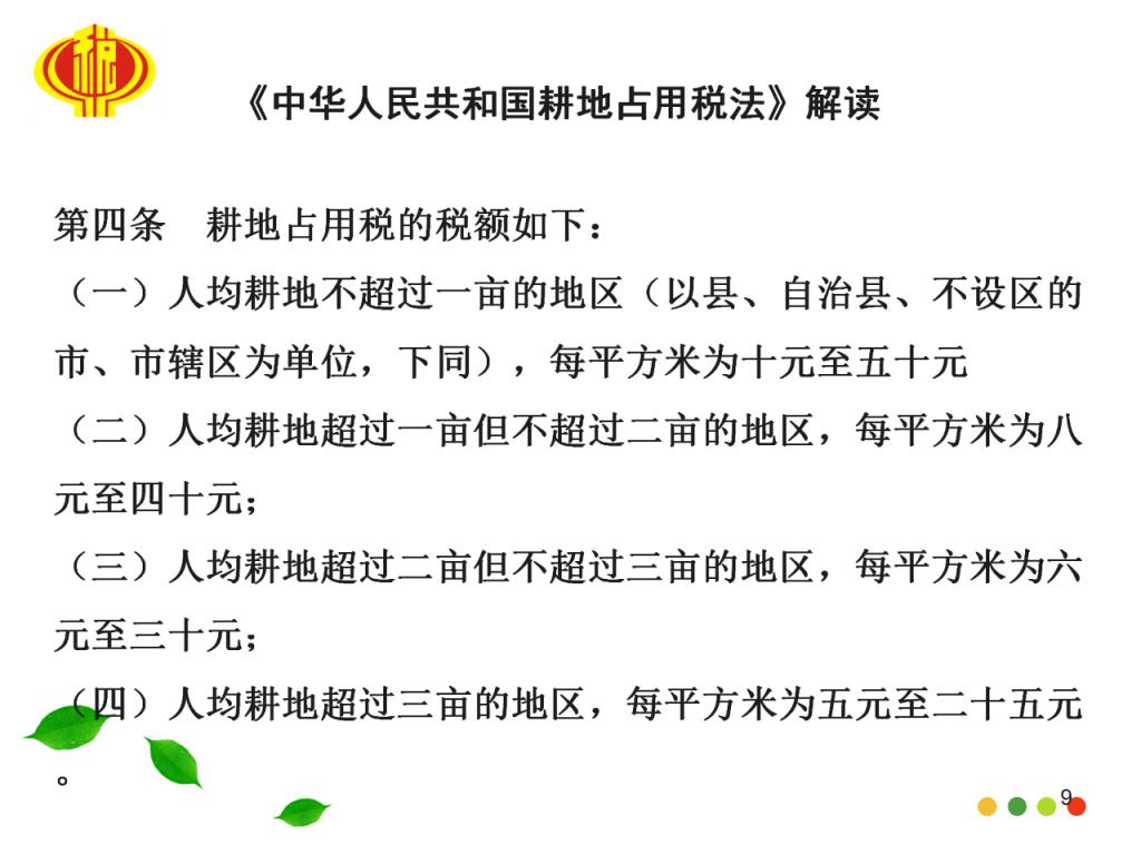 与原条例相比,从量定额的征收方式没有发生改变,授权地方在税法税额幅度内确定具体适用税额的规定没有发生变化。但是调整了适用税额制定权,将具体适用税额决定权由省级人民政府,调整至省级人民代表大会常务委员会决定。《耕地占用税法》将全国所有省份耕地占用税的平均税额分了9档,并附了《各省、自治区、直辖市耕地占用税平均税额表》,规定各地耕地占用税适用税额的平均水平不得低于平均税额表内的税额。同时规定,占用园地、林地、草地、农田水利用地、养殖水面、渔业水域滩涂以及其他农用地建设建筑物、构筑物或者从事非农业建设的,适用税额可以适当低于本地区确定的适用税额,但降低的部分不得超过50%。