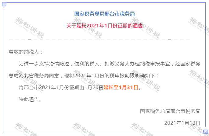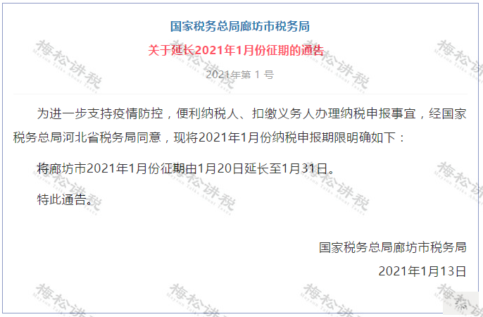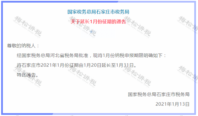 税局紧急通知!由于疫情原因,石家庄、邢台、廊坊等各地,1月份征期由120日延长至131日!