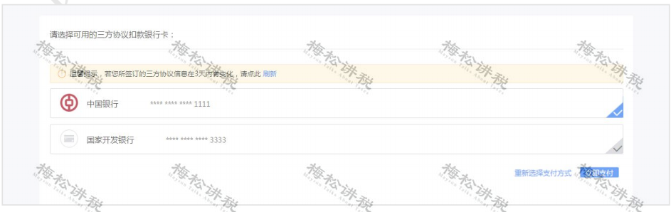 1)支付方式选择【三方协议缴款】,点击【立即支付】;确认此次缴税所使用的三方协议缴款账户,点击【确定】发起扣款请求完成缴税。