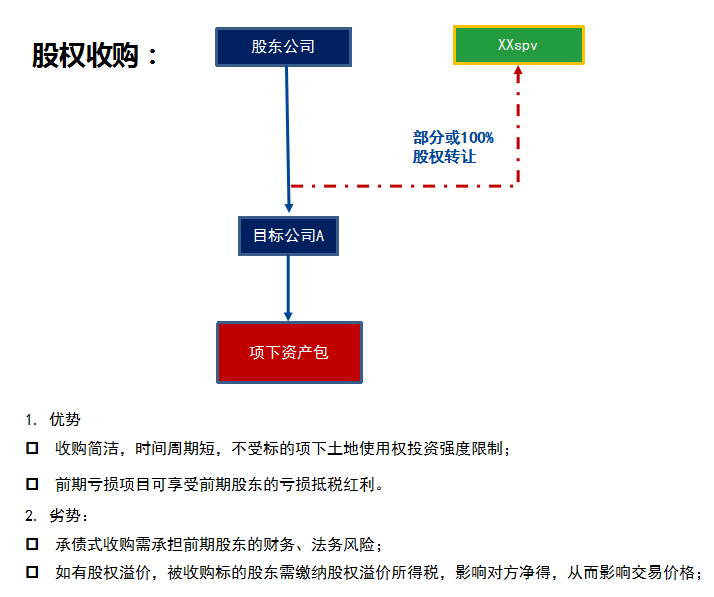 1.由于采用收购股权的方式,因此收购的是股权对应的全部资产减负债即权益。在取得目标资产的同时,还需要承继目标资产所在项目公司的历史债权债务,因此,采用股权收购方式需要进行严谨的尽职调查,防范潜在风险。