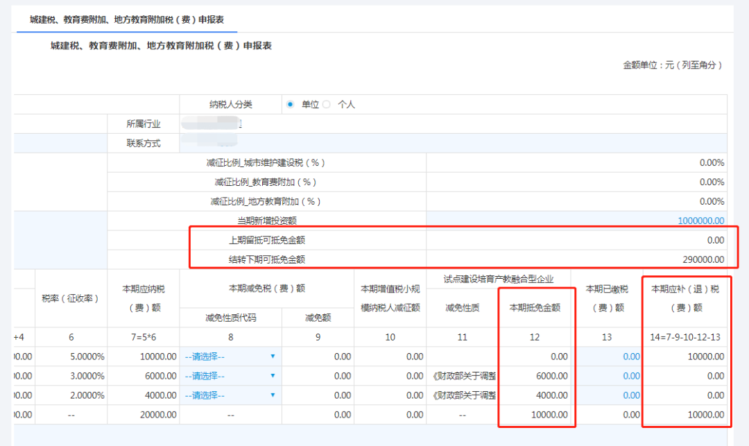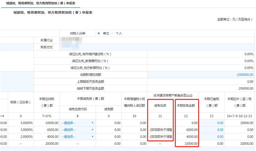 系统自动匹配减免性质(第11列),自动计算本期抵免金额(第12列)。