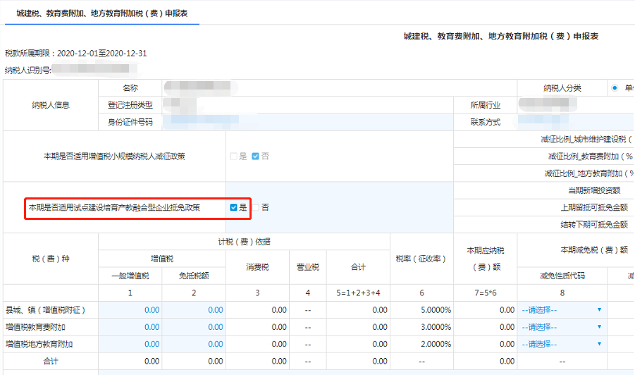 进入表单后,“本期是否适用试点建设培育产教融合型企业抵免政策”勾选“是”。