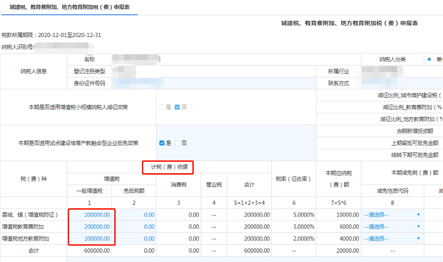 填写表单明细中三项附加税费的计税(费)依据,如已申报主税,系统将自动带出主税已申报信息。