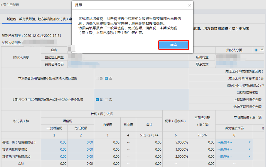 完成主税申报后,进入【城建税、教育费附加、地方教育附加税(费)】申报表,系统提示将获取主税申报信息,点击确定即可。
